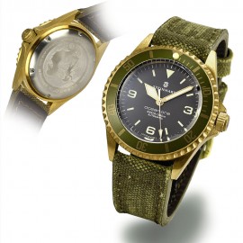 MOVEMENTETA 2824-2/SW 200, élaboréSwiss madeautomatic25 /26 Jewelssecond stopFUNCTIONSscrewed CrownCASEBronzeDiameter 42 mmHeight 14 mmWeight 107gLug width 22 mm spring barSapphire glass domed, with double anti-reflecting coatings on the interior sideBezel Bronze satin greenBack Stainless steel 316 L screwedWaterproof to 30 ATMDIAL & HANDDial g..